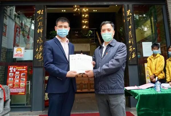 党员一行前往东灶鱼头火锅店送去抗疫物资和抗疫扶持政策宣传册。
